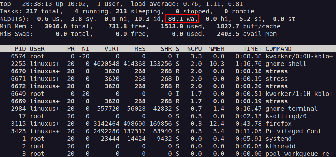 Τα σημεία συμφόρησης που σχετίζονται με δίσκους μπορούν επίσης να προκαλέσουν υψηλούς μέσους όρους φορτίου. Εκτελέστε τοtopεντολή και παρακολούθηση τουwaστήλη (αναμονή εισόδου/εξόδου). Εάν η χρήση του δίσκου είναι υψηλή, εξετάστε το ενδεχόμενο αναβάθμισης σε SSD, διανομή δεδομένων σε πολλούς δίσκους ή βελτιστοποίηση εφαρμογών που απαιτούν μεγάλους δίσκους.